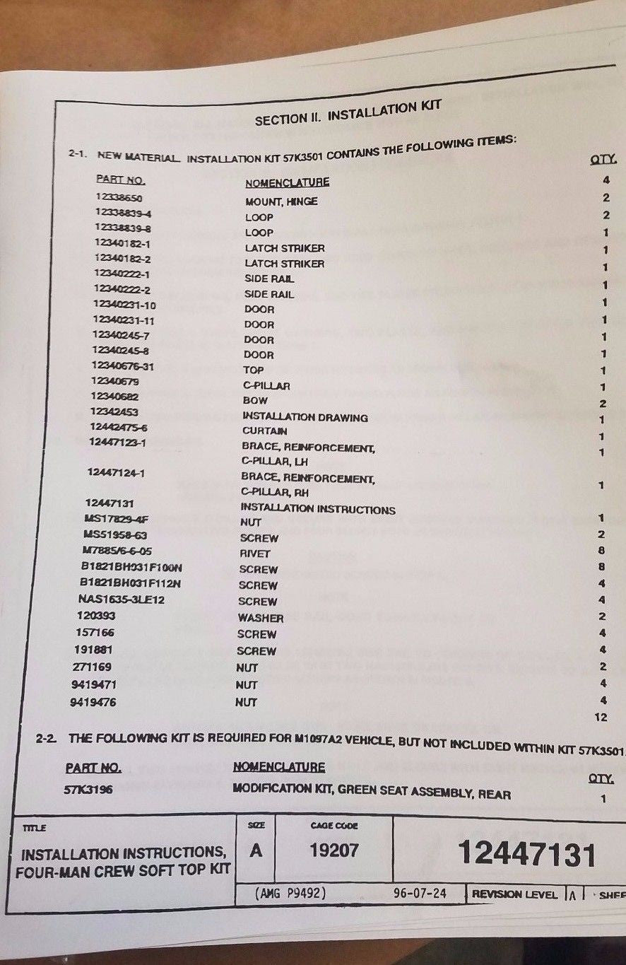 Instructions and all strikers, loops, mounts, brackets etc. needed to convert HMMWV from 2 to 4 man.